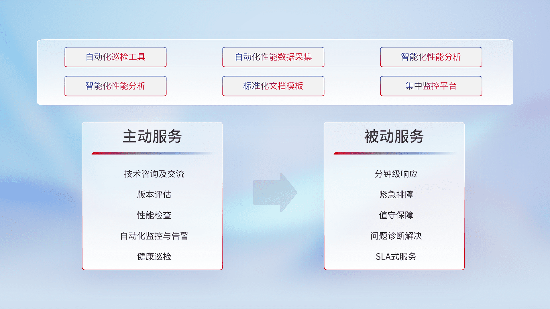 智能化工具和标准化文档,,保障服务质量,,提供主动服务(包含技术咨询、、、版本评估、、性能检查、、、、自动化监控与告警、、、健康巡检)和被动服务包含(分钟级响应、、、、紧急排障、、值守保障、、、问题诊断解决、、、、SLA服务)。。。
